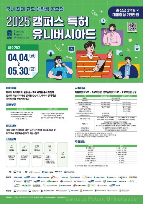 [와이뉴스] 특허청은 4월 4일~5월 30일까지 '2025 캠퍼스 특허 유니버시아드(Campus Patent Universiade, ‘CPU’)' 참가자를 모집한다고 밝혔다.