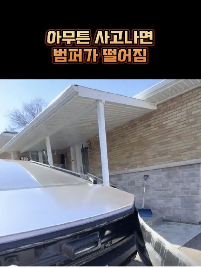 그런데 사고 이후 사이버트럭의 전면 범퍼가 떨어져 나갔다. 정확히 말하면 차체 왼쪽은 범퍼가 붙어있는데, 오른쪽만 떨어져 너덜너덜하게 붙어있는 모습이다.