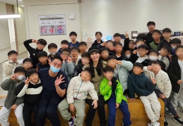 사진 속 장영란은 30명이 넘는 아이들에게 둘러싸여 환하게 미소 짓고 있다. 그 옆에 마스크를 쓰고 앉아 있는 남편 한창도 눈길을 끈다.