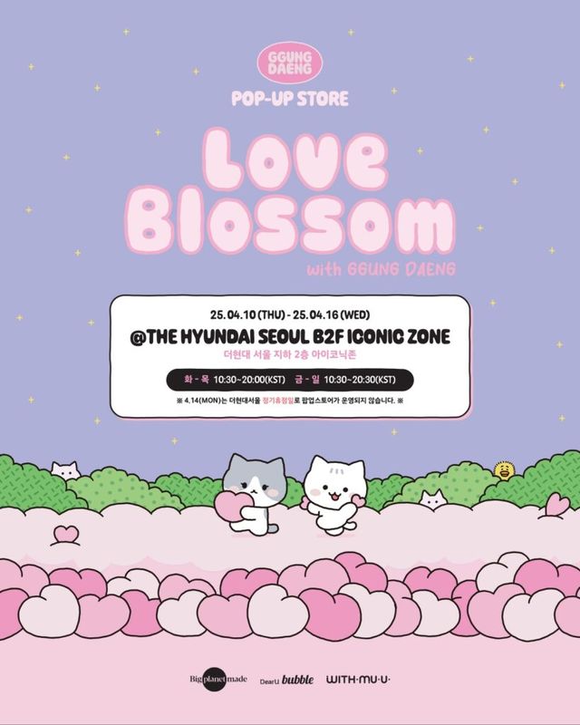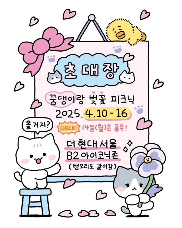 봄날의 벚꽃 피크닉처럼 귀엽고 따스한 팝업을 찾는다면, 더현대 서울로 발걸음을 옮겨보세요. 태민의 반려묘 꿍이와 댕이를 모티브로 한 캐릭터 ‘꿍댕이’가 봄맞이 팝업스토어로 찾아왔거든요. 이번 팝업에서는 MD 구매 시 띠부띠부씰과 댕버블 이용권이 선착순 증정되며, 랜덤 엽서와 꿍댕이 부채가 걸린 ‘꿍댕이를 찾아라’ 이벤트까지 준비돼 있어요. 귀여운 감성이 가득한 MD는 물론, 5만원 이상 구매 시 태민 포토 카드까지 받을 수 있답니다.
