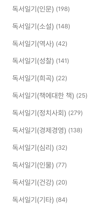 책을 분류하는 체계부터 남다르다. 자신의 블로그의 총 23개 카테고리 중 절반 가까운 12개 카테고리를 ‘독서 일기’로 지정 중인데, ‘인문’, ‘소설’, ‘역사’, ‘정치사회’, ‘희곡’ 등 보편적으로 분류되는 체계뿐 아니라 ‘성찰’, ‘책에 대한 책’으로까지 카테고리를 나누고 있다.