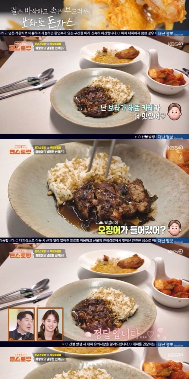 예비남편은 "돈가스 너무 맛있다. 겉바속촉"이라며 좋아했다. 예비남편은 "카레가 내가 먹던 카레와 다르다. 고춧가루가 들어간 것 같다. 매콤하고 맛있다. 보라가 해준 카레가 맛있다"라며 호평했다.