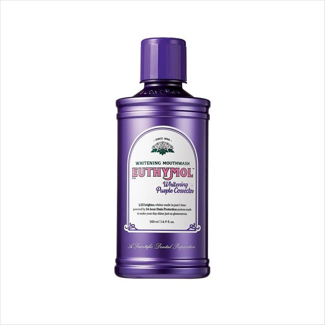 국내 최초 미백 가글. 치아의 누런 색을 중화시켜 시각적으로 밝아 보이게 만드는 퍼플코렉터 기술을 적용했다. 화이트닝 퍼플코렉터 가글 1만6천9백원 Euthymol.