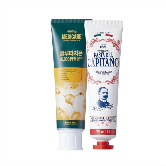 (왼쪽부터)시린 이와 약한 잇몸 케어를 위해 최근 핫한 글루타티온 성분을 담았다. 메디케어 글루타치온 클린민트 6천9백원 Bamboo Salt™. 치약과 민트, 시나몬 향의 블렌딩으로 양치 후 은은한 여운을 남긴다. 카피타노 오리지널 레시피 치약 2만2천원 Pasta Del Capitano.