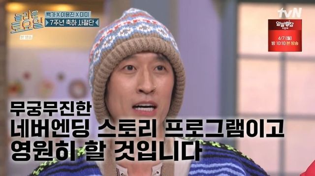 빽가는 ‘놀토’가 7주년까지 올 수 있었던 이유로 “끝이 없음” 때문이라고 했다고. 빽가는 “‘놀토’는 소재가 노래 제목을 맞히는 거다”라고 말문을 열었지만, 김동현은 “제목이 아니라 가사다”라고 시작부터 정정해 웃음을 안겼다. 빽가는 “대한민국에 몇 곡이 있을 것 같냐. 소재가 끝이 없다. 무궁무진한 네버엔딩 프로그램이고, 영원할 것”이라고 밝혔다.