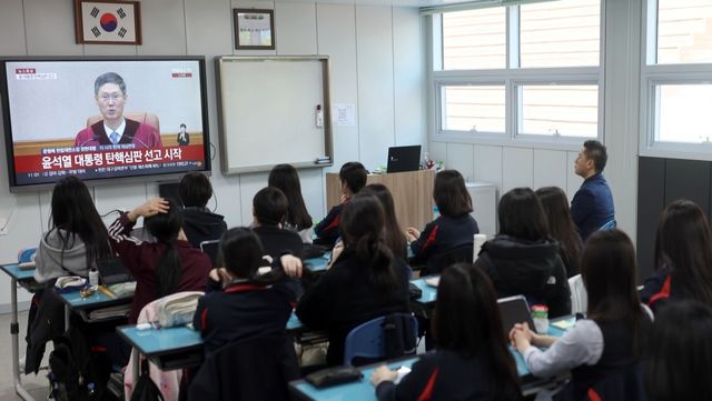 지난 4일 오전 경남 창원의 한 고등학교에서 1학년 학생이 윤석열 전 대통령 탄핵심판 선고 생방송을 지켜보고 있다. / 연합뉴스