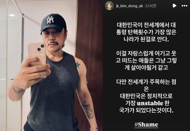 그는 이어 “다만 전 세계가 주목하는 점은 대한민국은 정치적으로 가장 unstable(불안정한)한 국가가 되었다는 것이다. #Shame(부끄러운)”이라고 했다.