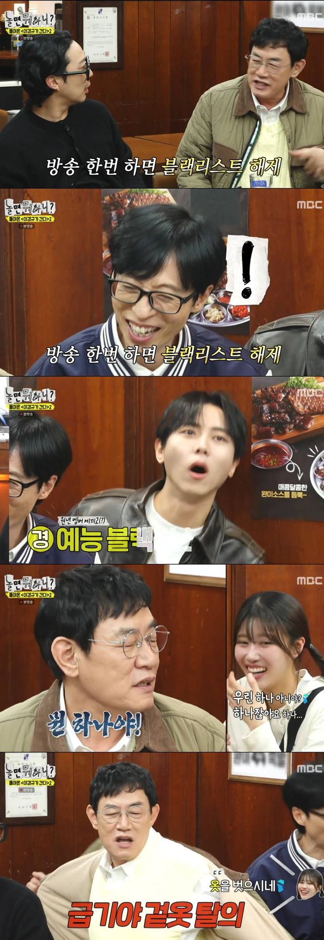 유재석은 "이 블랙리스트는 형이랑 방송을 하면 해제되는 거냐"라며 웃었고, 하하는 "우재가 날 제친 거냐"라고 반응해 웃음을 더했다. 이후 주우재는 "충신으로 오늘"이라고 받아쳤다.