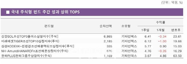 6일 펀드평가사 KG제로인에 따르면 순자산액(클래스 합산) 100억원 이상, 운용 기간 1개월 이상인 국내 주식형 펀드의 최근 일주일(3월28~4월 4일) 수익률을 분석한 결과 한 주간 가장 높은 수익률을 기록한 펀드는 신한자산운용의 ‘SOL 조선 TOP3 플러스’ ETF로 6.41%의 수익률을 보였다.
