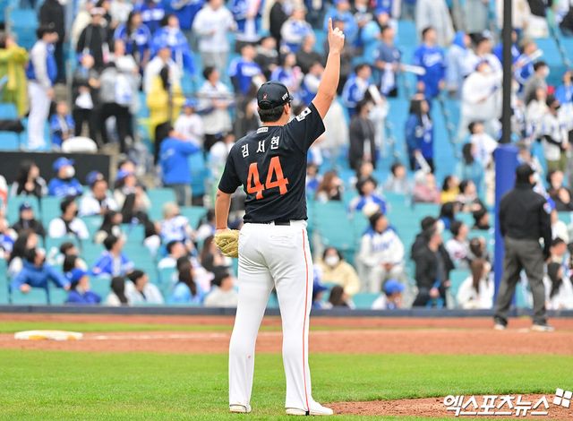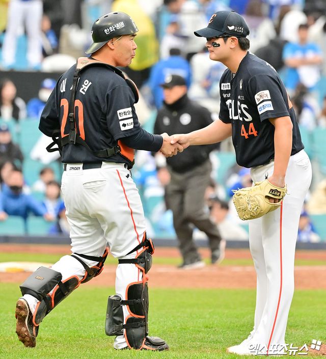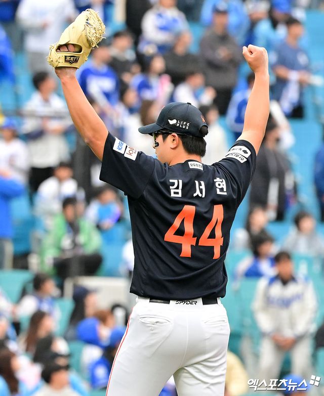 지난달 29일 대전 KIA전 세이브 이후 출전 기회가 없어 4일 점검 차 등판해 ⅓이닝 무실점을 기록했던 김서현은 이틀 연속 마운드에 올랐다. 그리고 이재현을 유격수 땅볼, 구자욱을 2루수 땅볼, 김영웅을 좌익수 뜬공으로 돌려세웠다. 직구 최고 157km/h, 체인지업이 무려 148km/h가 찍혔다. 큰 위기 없이 경기를 끝낸 김서현은 두 손을 번쩍 들어올려 역전승의 완성을 알렸다.