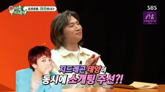 서장훈은 "같은 날 같은 시간에 지드래곤과 태양이 소개팅을 시켜주면 어느 자리에 나가겠냐"고 물었고, 대성은 기혼자인 태양을 선택하며 "결혼 후 세상을 보는 눈이 달라졌을 거라고 생각한다"고 설명했다.