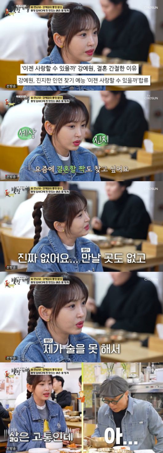 허영만은 "짝을 찾을 데가 없나?"라며 의아해했고 강예원은 "진짜 없고 만날 곳도 없다. 제가 술도 못 마신다"라며 안타까워했다. 허영만은 "기회가 남들보다 적네"라고 말했고 강예원은 고개를 끄덕이며 "확실히 그런 것 같다"라고 답했다.