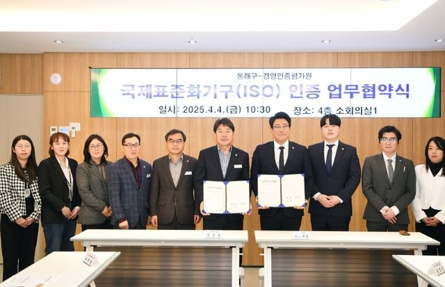 [파이낸셜경제=김예빈 기자] 부산 동래구는 지난 4일 경영인증평가원(기관장 신솔푸름)과 지역 내 기업들의 국제 경쟁력 강화를 위한‘국제표준화기구(ISO) 인증업무협약’을 체결했다고 밝혔다.