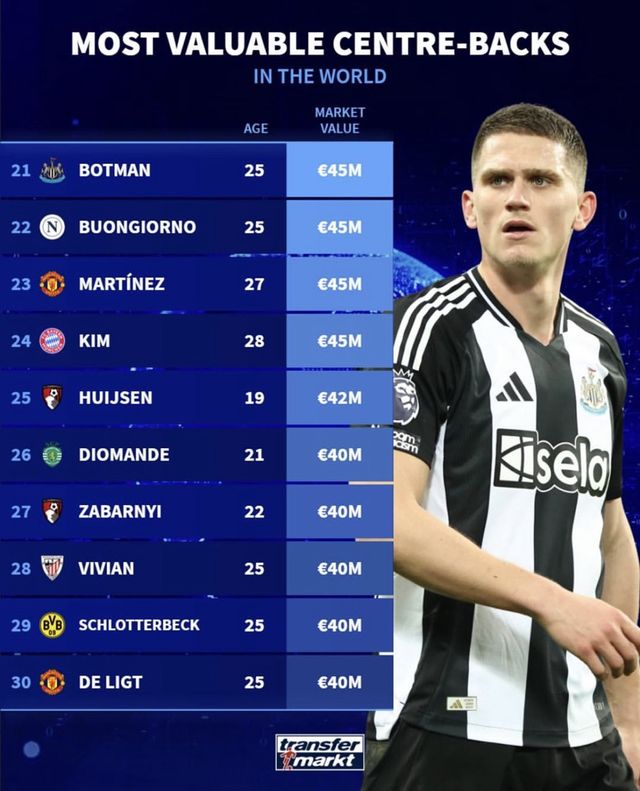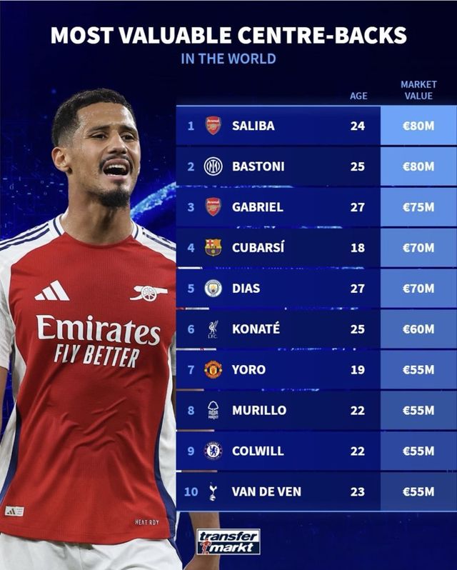 축구 이적 전문 사이트 트랜스퍼마르크트는 최근 전 세계 중앙 수비수들의 몸값 순위를 매겨 상위 30인 명단을 공개했다. 이 가치는 선수의 연봉이 아닌, 이적 시 발생하는 예상 이적료라고 볼 수 있다. 선수의 기량, 나이 등 여러 요소를 고려해 가치를 추산한다.
