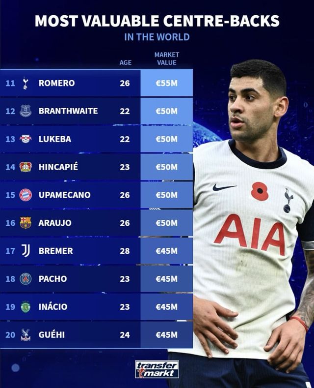 잉글랜드 프리미어리그(EPL)에서 부진을 거듭하는 토트넘의 센터백 듀오 미키 판 더 펜과 크리스티안 로메로가 몸값 5000만 유로(802억원)로 공동 7위에 올랐다. 늘 중상위권에는 자리하던 토트넘은 올 시즌 EPL 20개 팀 중 14위까지 처져있다.