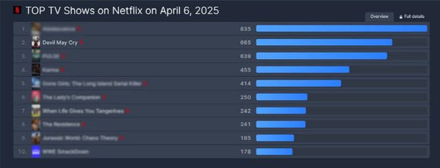 애니메이션 데빌메이크라이는 지난 3일 전 세계에 공개된 직후 폭발적인 시청률을 기록하며, 넷플릭스 사용 국가 91개국에서 TV쇼 부문 톱 10에 진입했다. 넷플릭스 글로벌 전체 기준으로는 2위에 이름을 올렸다. 이는 데빌메이크라이의 작품성과 대중성을 동시에 인정받은 결과로, 스튜디오미르의 존재감이 다시 한번 글로벌 무대에서 드러났다는 게 회사의 설명이다.