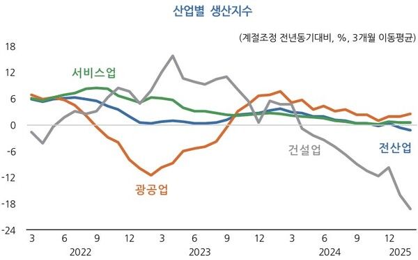 조업일수 영향이 보정된 계절조정 전년 동월 대비 증가율 기준으로도 건설업(-21.7%)이 크게 감소한 가운데, 광공업(1.0%)과 서비스업(0.1%)도 낮은 증가세에 그치며 산업 전반에서 생산이 둔화되는 모습이다.