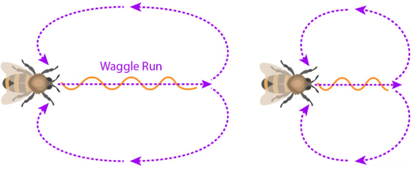 벌집으로 돌아와 특유의 ‘둥근 춤(waggle dance)’을 추며 정보를 공유해요.