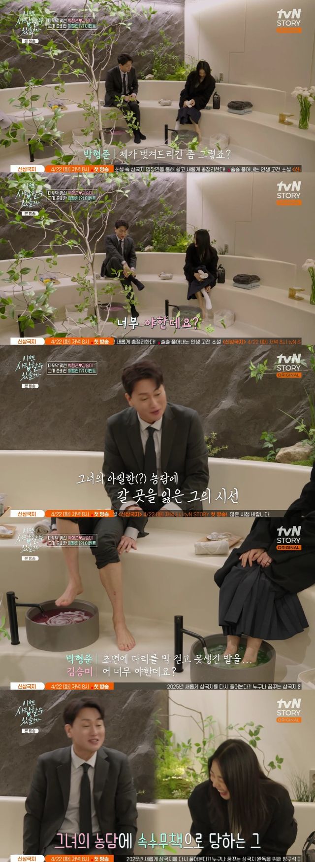 박형준이 “초면에 다리를 막 걷고, 못생긴 발을 보여드리다니…”라며 쑥스러워하자, 김승미는 다시 한 번 “너무 야하다니까요”라며 웃음 섞인 농담으로 분위기를 한층 더 달아오르게 만들었다.
