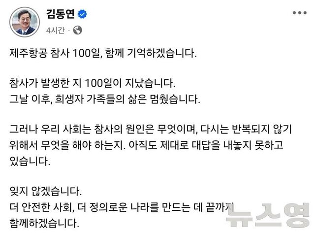 김동연 지사는 7일 자신의 SNS 페이스북을 통해 “참사가 발생한 지 100일이 지났다”며 “제주항공 참사 100일, 함께 기억하겠다”고 다짐했다.