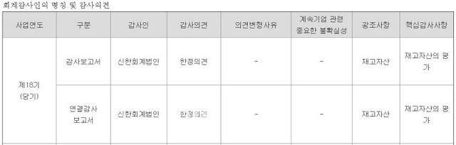 이어 2024년도 제 18기 별도 및 연결재무제표에 대해서 감사범위제한에 해당하는 재고자산 금액 변동이 있을 수 있음을 예고했다.