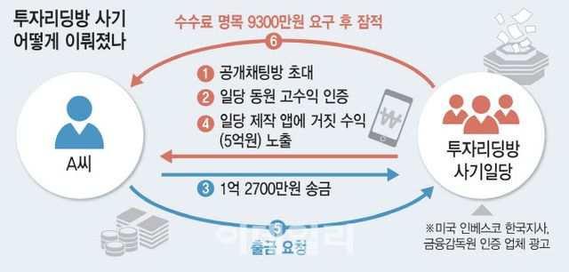 [이데일리 송승현 기자] A씨는 2024년 12월 유튜브를 통해 주식을 추천해주는 이른바 ‘리딩방’을 알게 됐다. 그들은 자신들이 ‘미국의 자산운용사인 인베스코의 한국지사이며 금융감독원의 승인을 받았다’고 안내했다. 이후 A씨는 일당의 요구대로 자체 제작한 애플리케이션(앱)을 설치한 뒤, 돈을 송금하면 국내 주식과 미국 주식에 투자해 수익을 얻을 수 있다는 말에 넘어가 총 1억2700만원을 송금했다. 앱상 원금이 5억원으로 불어나는 것을 본 A씨는 돈을 출금하려 했지만 일당들은 할당된 수수료 9300만원을 요구하며 출금을 거부했다. 앱상 불어난 돈은 거짓이었기 때문이다.