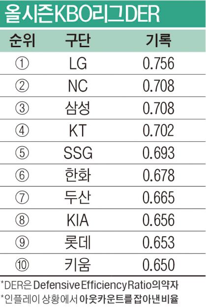 KIA의 올해 DER(수비 효율·Defensive Efficiency Ratio)은 8위에 머문다. DER은 팀의 수비력을 평가하는 지표 중 하나로 볼넷, 삼진, 홈런 등을 제외하고 수비수가 타구를 처리할 수 있는 인플레이 상황에서 아웃카운트를 잡아낸 비율을 의미한다. 값이 클수록 수비가 좋은 팀이라고 할 수 있다. 메이저리그(MLB)에서는 0.700을 DER의 평균(0.720 이상 훌륭, 0.680 이하 최악)으로 해석한다. 그런데 올해 KIA의 DER은 0.656(1위 LG 트윈스·0.756)이다. 키움 히어로즈(0.650) 롯데 자이언츠(0.653)에만 겨우 앞선다. 그만큼 수비가 비효율적이다.