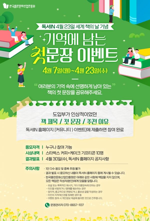 한국출판문화산업진흥원이 세계 책과 저작권의 날을 맞아 ‘기억에 남는 첫문장 이벤트’를 진행한다.