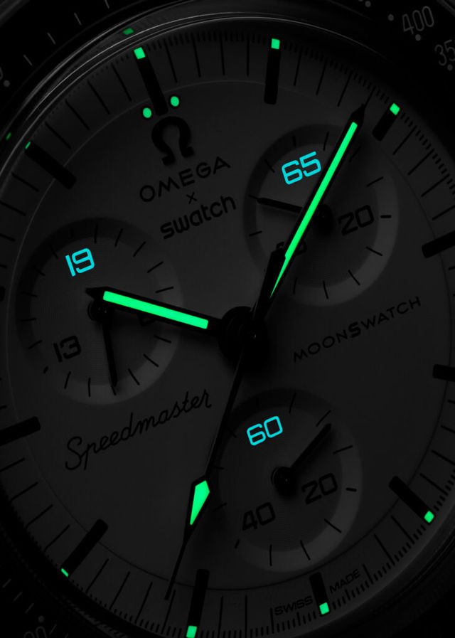 이번 에디션은 스와치가 자체 개발한 친환경 소재인 바이오세라믹으로 제작됐어요. 이 소재는 플라스틱의 가벼움과 세라믹의 견고함을 동시에 갖춘 혁신적인 신소재로, 장시간 착용해도 피부에 부담이 적고 부드러운 착용감을 선사하는데요. 오메가 스피드마스터의 상징적인 DON 디테일과 비대칭 케이스 구조도 정교하게 복원되었습니다.