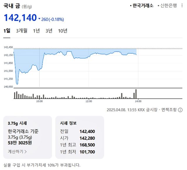 국내 금시세(금값)가 8일(한국 시각) 오후 하락세(전 거래일 대비)를 보이고 있다.
