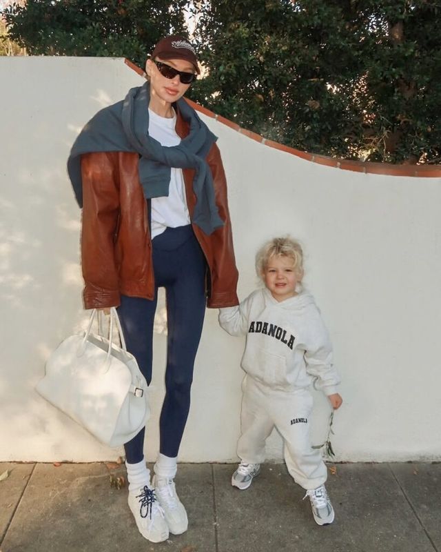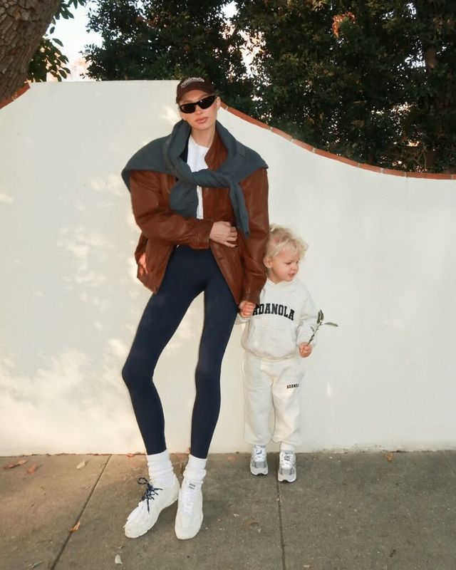 엘사 호스크는 ‘애슬레저=운동복’이라는 공식을 뒤집었습니다. 네이비 레깅스와 화이트 스니커즈 조합으로 편안한 무드를 연출하고, 빈티지한 레더 재킷에 볼캡, 선글라스를 더해 룩의 완성도를 끌어올렸죠. 운동 후 커피 한 잔, 가벼운 외출까지 자연스럽게 이어지는 이 스타일은 실용성과 감각을 모두 챙긴 데일리 애슬래저 라이프 스타일이죠.