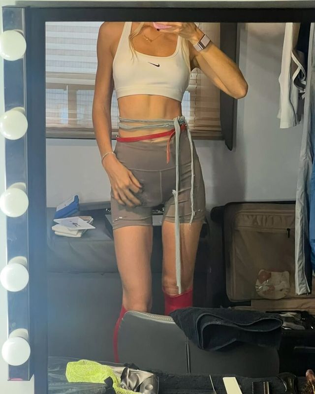 화이트 스포츠 브라톱에 바이커 쇼츠, 그리고 하이 웨이스트 밴딩 포인트까지. 아이리스 로는 애슬레저를 완전히 자기만의 룰대로 즐깁니다. 여기에 레드 니삭스와 실버 스니커즈를 매치해 유쾌하고 도발적인 분위기를 완성했죠. 스포티하면서도 패셔너블한 이 믹스매치야말로, 아이리스만의 확실한 무기입니다.