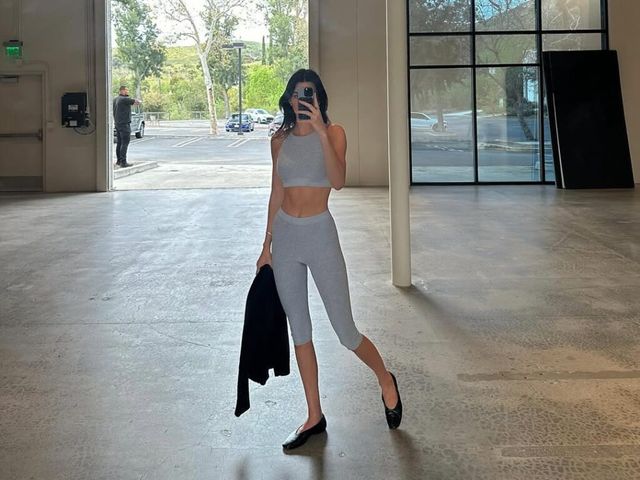 애슬레저도 이렇게 쿨할 수 있다는 걸 보여준 켄달 제너의 그레이 셋업. 슬림한 브라톱과 5부 레깅스로 실루엣을 강조하고, 블랙 플랫 슈즈와 숄더백으로 페미닌한 무드를 살짝 더했죠. 무심한 듯 시크한 켄달 특유의 무드가 자연스럽게 스며든 애슬레저 룩입니다.