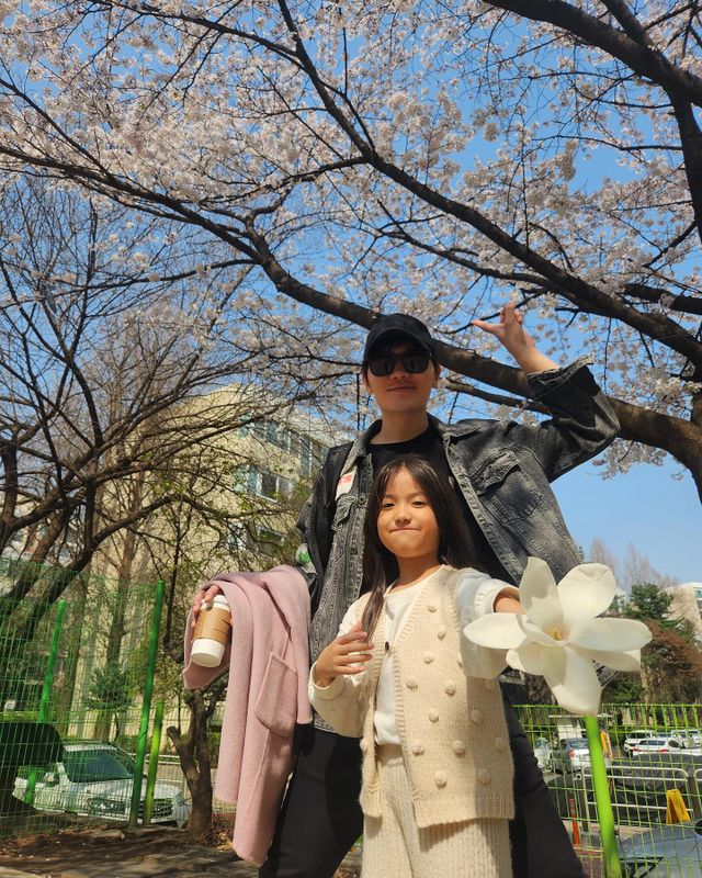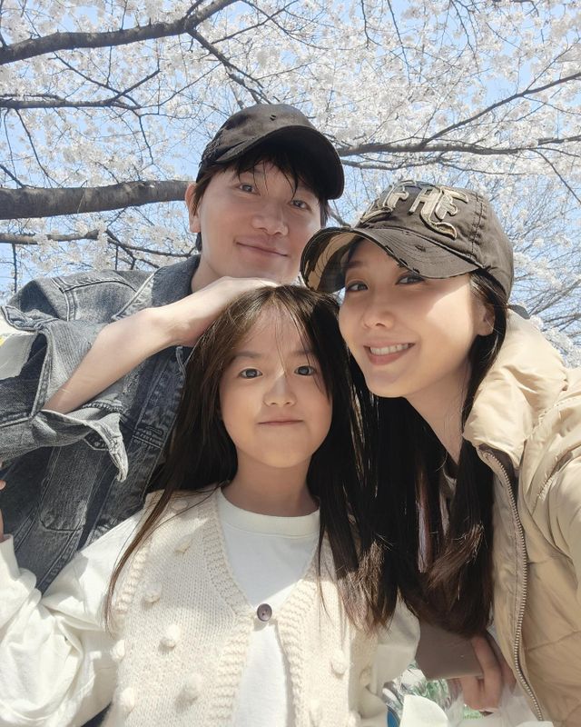 사진 속에는 벚꽃 나무 아래 미소 짓고 있는 김정근 이지애 부부와 딸의 모습이 담겨 있다. 또 다른 사진은 김정근 부녀의 개구진 포즈가 눈길을 끈다. 행복함이 묻어나는 가족의 하루가 훈훈함을 자아낸다.