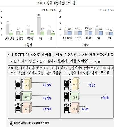 연구진은 “병원·의원급의 입원 치료에 비효율이 존재함을 시사한다”며, “의료기관에 따른 입원기간의 차이를 최소화하기 위해서는 고혈압과 폐렴의 적정 진료에 대한 임상적 기준 정립이 필요해 보인다”고 강조했다.