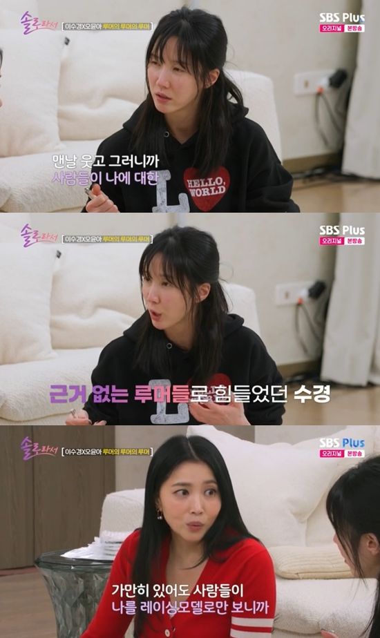 8일 방송된 SBS Plus·E채널 '솔로라서'에서는 이수경과 오윤아가 사람들의 선입견과 뒷말로 상처받았던 일을 떠올리는 모습이 그려졌다.
