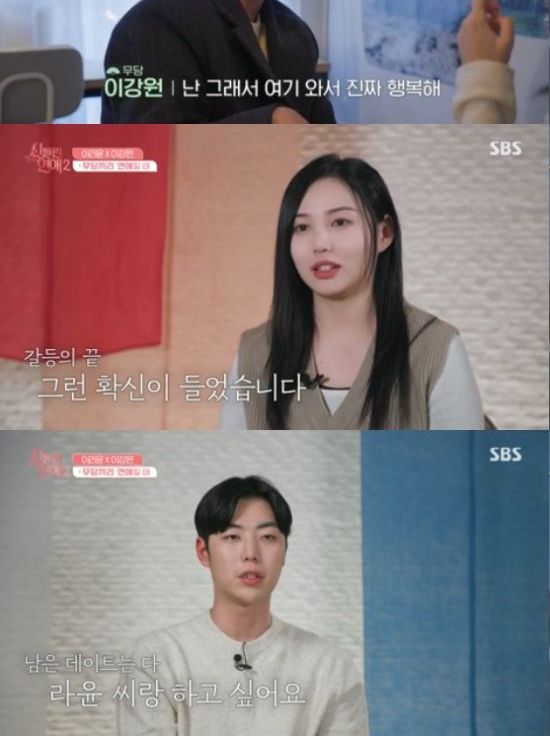 이라윤은 "나는 나랑 잘 맞는 사람을 찾으러 여기에 왔다. 그게 강원 씨라고 생각을 했다"고 했고, 이강원 역시 "내가 할 수 있는 표현은 다 했다고 생각한다. 고민이 됐던 날이 없었고, 앞으로도 없을거다. 라윤 씨가 제일 좋다"고 서로의 마음을 고백했다.