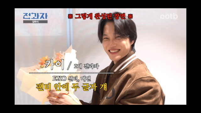 2대 전과자로 합류한 카이는 ‘전과자’ 첫 촬영 전 인터뷰에서 “바로 어제 소집 해제했다”고 밝히며 복귀 후 활활 타오르는 ‘열일’ 의욕을 드러냈다. 툭툭 직설적인 멘트를 던지며 장난꾸러기 모습으로 학생들을 편안하게 만들어준 이창섭과 다르게, 카이는 성실한 태도로 의욕 넘치면서도 엉뚱한 면모로 매력을 뽐낸다. 첫 촬영에 카이스트를 방문한 카이는 “온 세상이 카이잖아”라고 말하는가 하면, 용인대학교 무도학과에 방문해 씨름부 선수들에게 종잇장처럼 픽픽 넘어가면서도 “팬티 안에 두 글자. 바로 모래”라고 말하는 센스를 발휘했다.