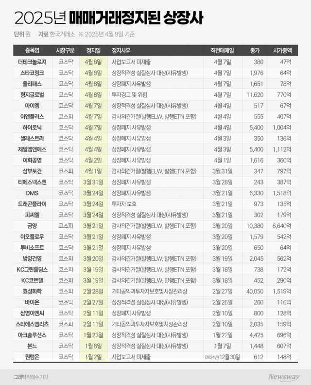 9일 한국거래소에 따르면 연초부터 지난 8일 기준 매매거래정지(스팩합병, 코넥스 제외)된 상장사만 28종목에 달하는 것으로 나타났다. 올해가 시작된 지 4개월 만에 전년(39곳)도의 71% 수준을 기록한 것이다.