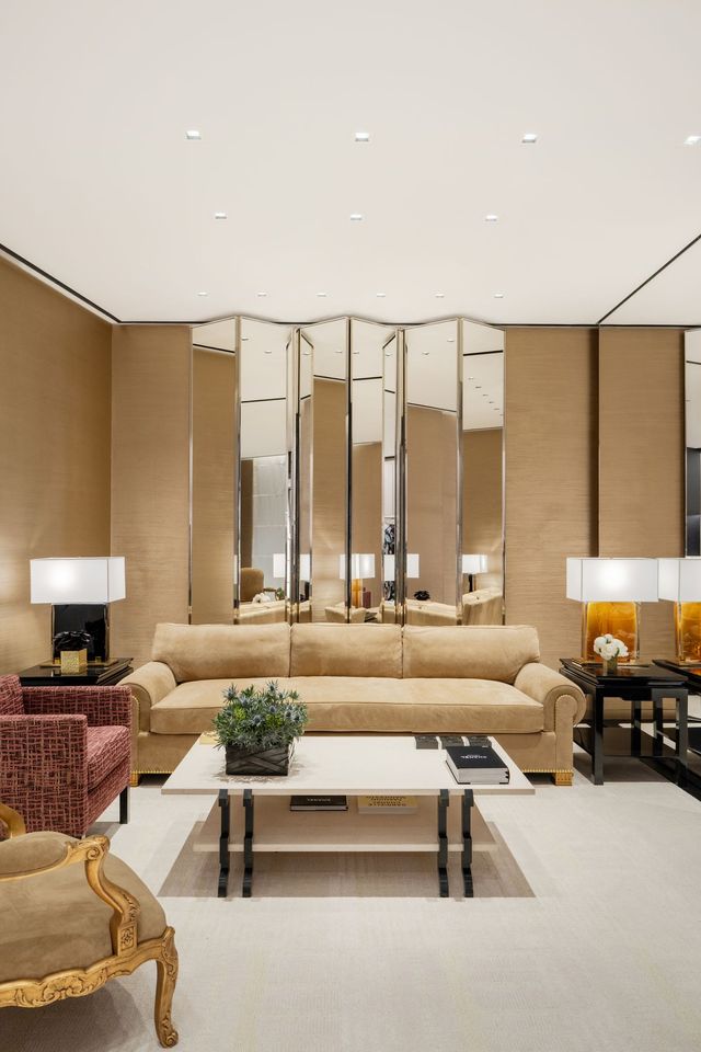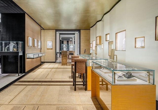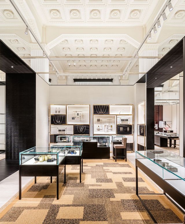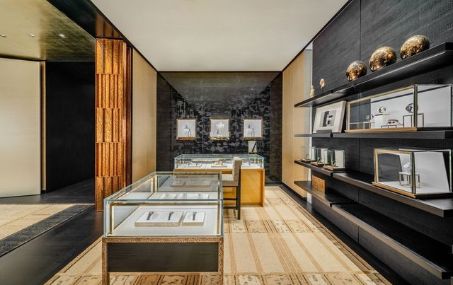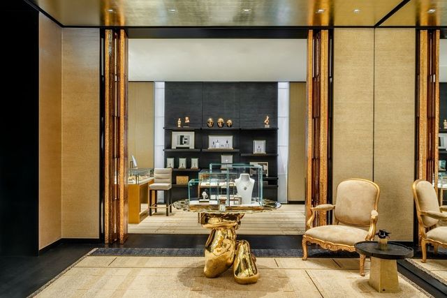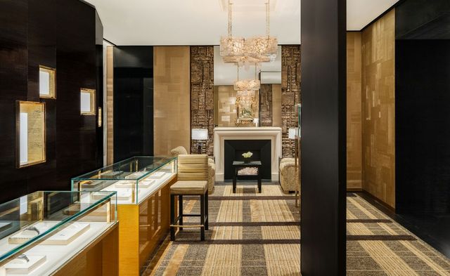 1층의 중앙 공간을 따라 이어지는 워치 & 화인 주얼리 공간은 보다 친밀한 분위기를 자아낸다. 수작업으로 금박을 입힌 천장과 섬세하게 마감된 골드 메탈 블랙 캐비닛 벽이 조화를 이룬다. 여기서 끝이 아니라 2층에도 또 하나의 워치 & 화인 주얼리 살롱이 마련되어 있다. 아르데코에서 영감을 받은 카펫의 메탈릭한 디테일을 비추는 브론즈 스크린과 해머드 브론즈 메탈 캐비닛이 공간을 장식한다. 한쪽 벽난로 옆에는 피터 레인의 유약을 입힌 세라믹 벽 조각이 배치되어 있으며, 로베르 구센의 샹들리에가 화려한 중심을 이룬다.