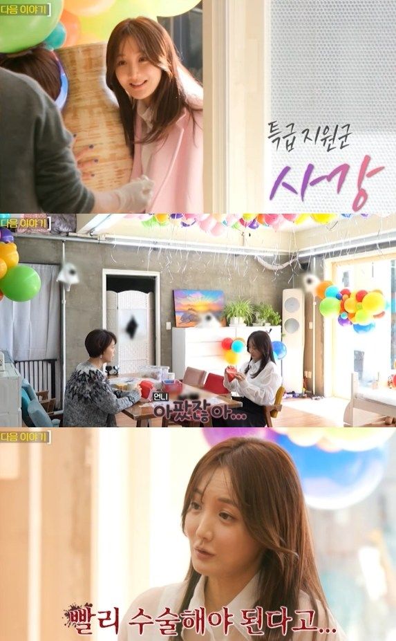 황정음이 "언니 아팠잖아"라고 운을 띄우자 사강은 "(병원에서) 빨리 수술해야 한다더라. 몸 안에서 장기 파열이 일어났다"고 고백해 황정음을 놀라게 했다.