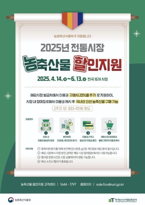 [와이뉴스] 농림축산식품부는 전통시장 소비자의 물가 부담 완화를 위해 4월 14일부터 6월 13일까지 전국 16개 전통시장에서 '전통시장 농축산물 상시 할인 시범 사업'을 실시한다.