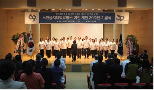 을지재단가 제창도 이목을 끌었다. 1995년 노원을지대병원 입사 30년을 맞은 개원 멤버 20명이 무대에 직접 올라 기념식 참석자 모두와 재단가를 함께 부르며 감동적인 하모니를 연출해 기념식의 의미를 더했다.