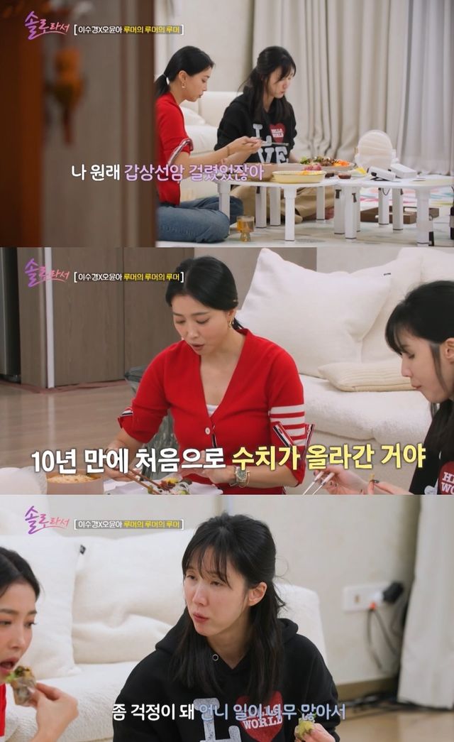 이수경이 "언니가 일이 너무 많아서 걱정된다"고 하자 오윤아는 "근데 일을 또 해야 한다. 나 혼자 벌어서 사는데"라고 답했다.