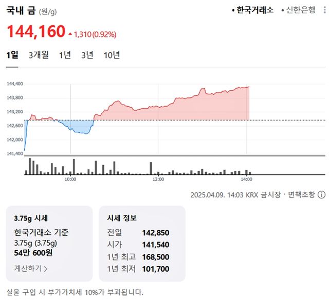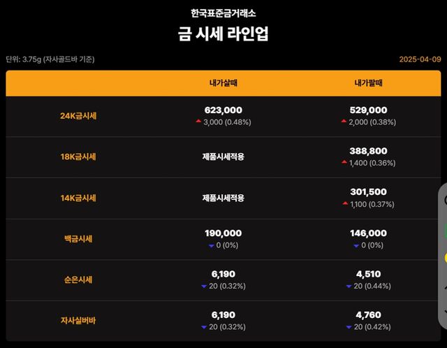 국내 금시세(금값)가 9일(한국 시각) 오후 상승세(전 거래일 대비)를 보이고 있다.