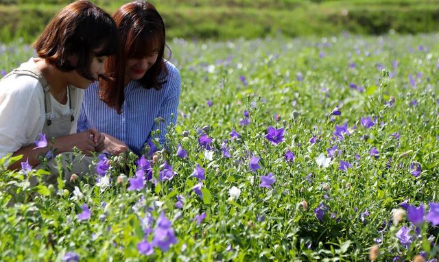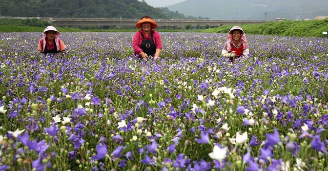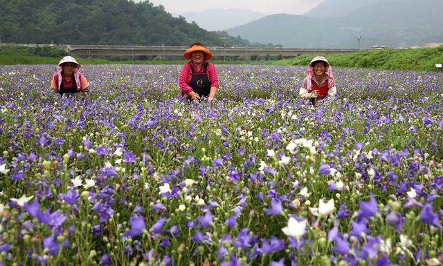 2013년 7월 31일 경남 산청군 정광들녘 약초재배단지에 보라색과 흰색이 어우러져 우아한 자태를 뽐내는 도라지꽃이 만발한 가운데 농민들이 잡초제거 작업을 하고 있다 / 뉴스1(산청군 제공)