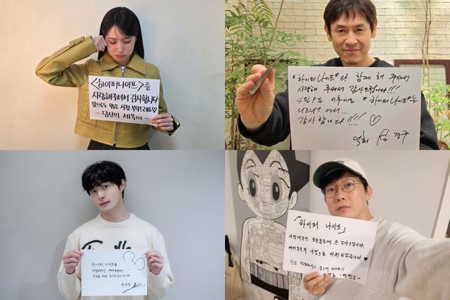 먼저 천재외과 의사 ‘정세옥’ 역으로 또 하나의 인생 열연을 펼친 박은빈은 눈물을 훔치는듯한 귀여운 포즈와 함께 “하이퍼나이프를 사랑해 주셔서 감사합니다. 앞으로도 많은 시청 부탁드려요”라고 전하며 팬들에게 따뜻한 감사 인사를 전했다. 이어 ‘세옥’의 스승이자 최고의 신경외과 의사 ‘최덕희’ 역의 설경구는 작품의 공식 굿즈인 나이프를 손에 들고 “하이퍼나이프와 함께해 주셔서, 사랑해 주셔서 감사드립니다. 4월 9일 이후에도 하이퍼나이프는 디즈니+에서..”라며 종영 이후에도 디즈니+에서 정주행 할 것을 당부하며 작품에 대한 깊은 애정을 드러냈다. ‘세옥’의 옆을 지키는 든든한 조력자 ‘서영주’ 역의 윤찬영은 “하이퍼나이프를 사랑해 주신 여러분들께 진심을 다해 감사드립니다”라며 깊은 애정을 전했고, ‘세옥’과 불법수술을 함께한 마취과 의사 ‘한현호’ 역을 맡은 박병은은 “하이퍼나이프를 사랑해 주신 모든 분들께 큰 감사드립니다. 여러분들의 사랑으로 마취되었습니다. 항상 행복하시고 웃으며 살아요!”라며 특유의 유머를 담아 재치 있는 감사 인사를 전했다.