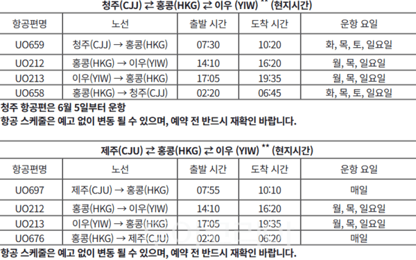 한국에서는 청주·제주-홍콩-이우 노선을 통해 홍콩과 이우 여행을 즐길 수 있다.