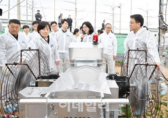 부총리와 송 장관은 이동형 열풍방상팬 등 재해예방시설과 무인급수시설을 둘러보고 관계자들의 설명을 들었다. 열풍방상팬이란 서리 등 냉해 피해 예방을 위해 따뜻한 바람을 재배지역으로 넓게 퍼뜨리는 기계다. 이동형 방상팬은 대당 설치비용이 400만원 수준으로 3대면 1㏊(헥타르) 면적의 냉해 피해를 막아준다.