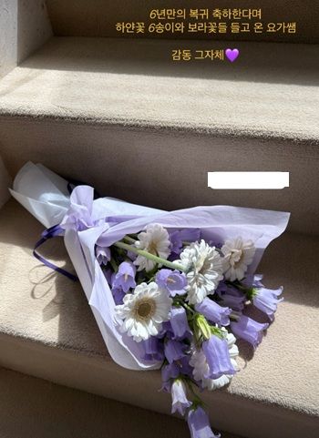 8일 박한별은 "6년만의 복귀 축하한다며 하얀 꽃 6송이와 보라 꽃을 들고 온 요가쌤. 감동 그 자체♥"라는 글과 함께 자신이 받은 꽃다발을 자랑했다.